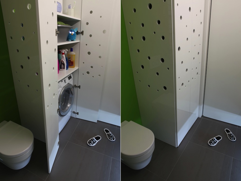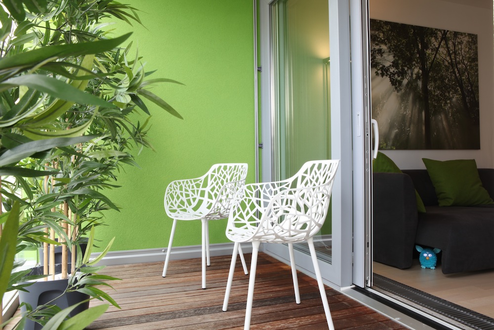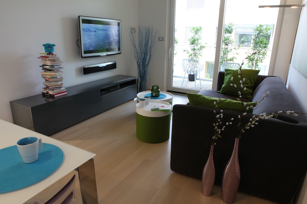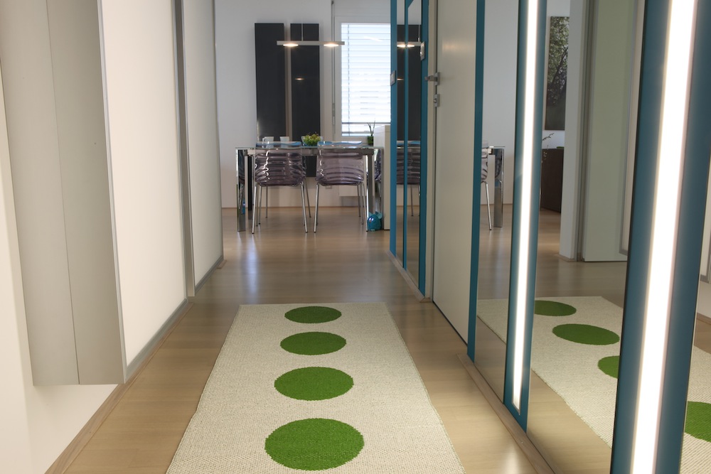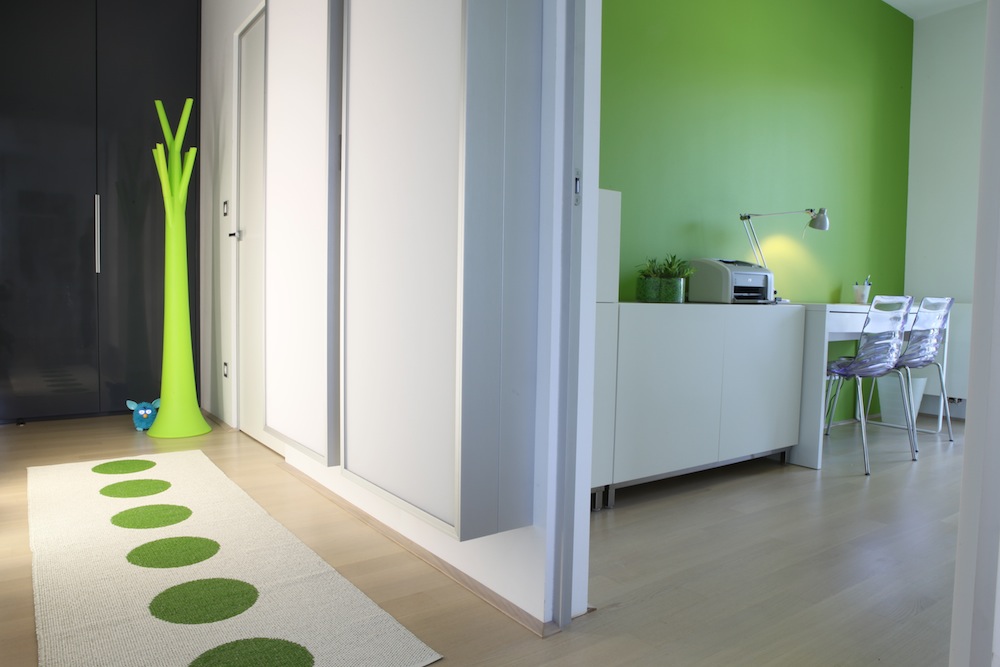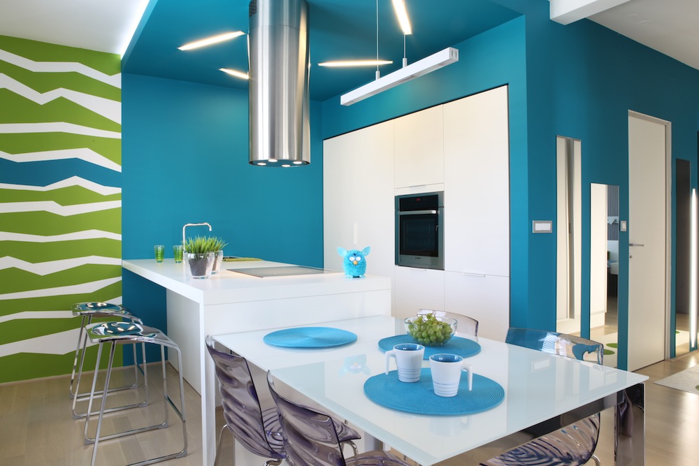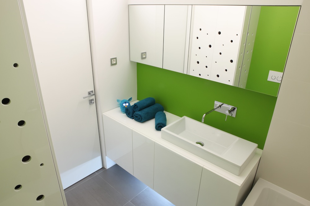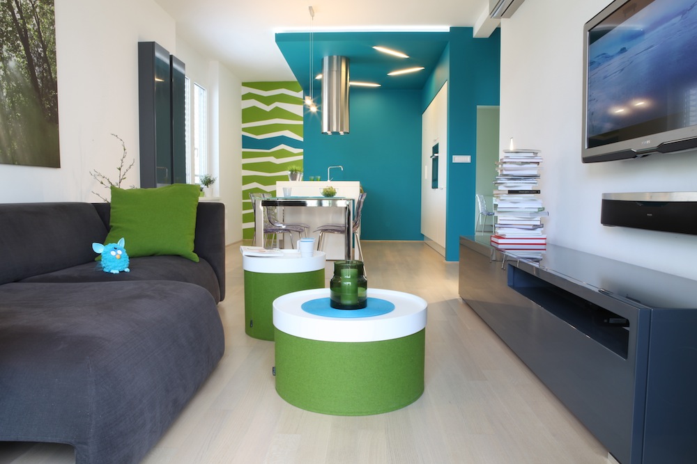 Ozirajoč se na barvo fasade objekta, ki je opazna, ko se dnevna soba skozi panoramska okna nadaljuje v teraso, je bila izbira zelene barvne teme interierja samoumevna. Dopolnjuje jo svetla petrolejsko modra. Gre za moderno interpretacijo zelenih dreves in modrine tolmuna, na kar se navezujejo tudi mestoma igrivi dodatki.