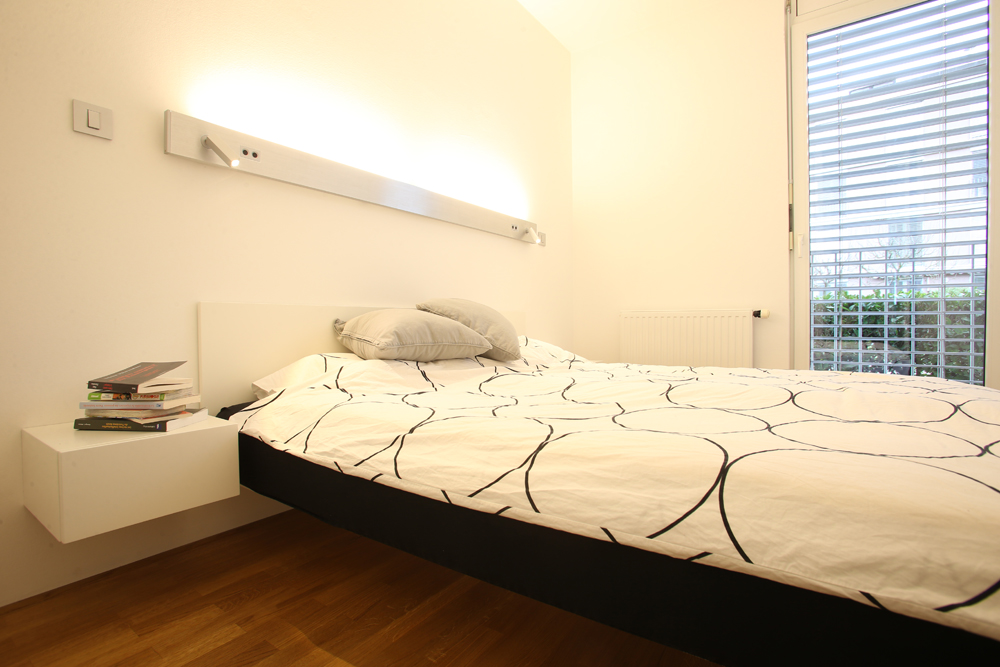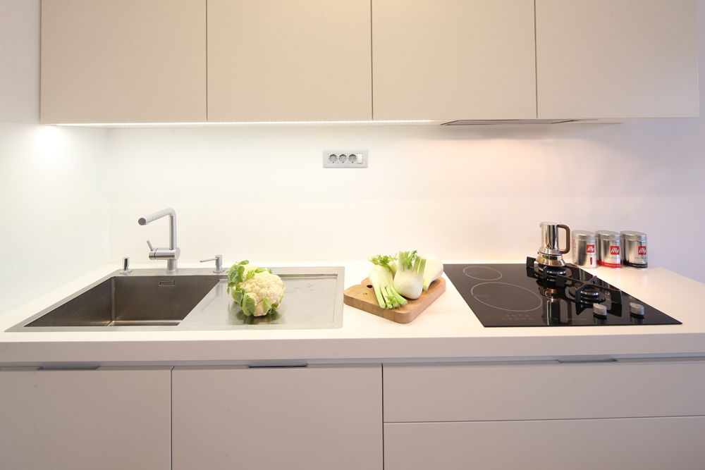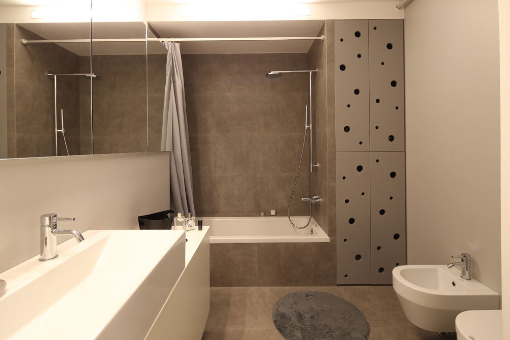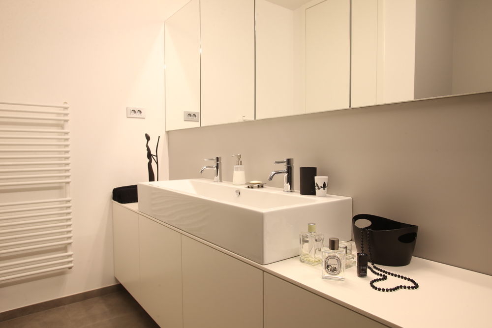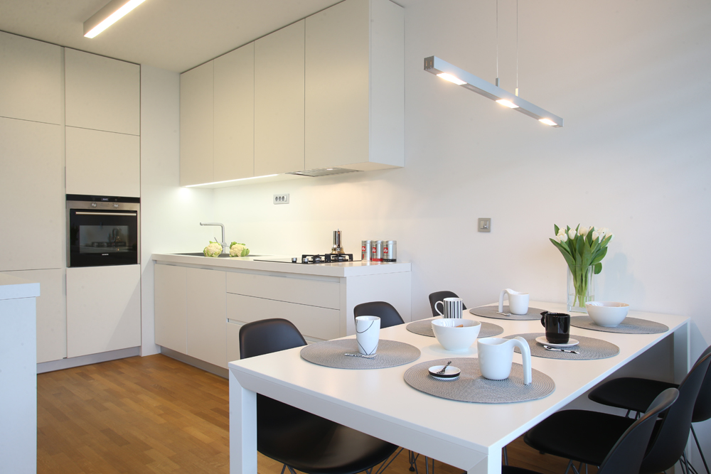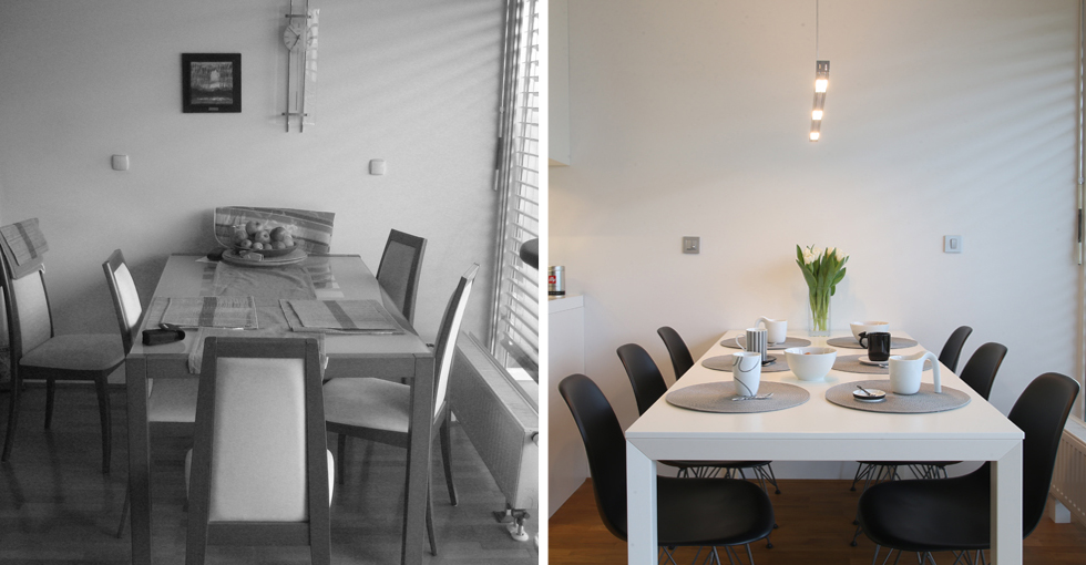 Z barvami smo sledili želji stranke po barvnem minimalizmu. Belo osnovo sami uspešno dopolnjujejo z izborom črnih ali sivih dodatkov, opremo izčiščenih linij pa je po naših načrtih izdelal mizar. Tej rdeči niti sledi tudi izbor svetil, kjer smo se v večji meri ozirali na že obstoječe električne priključke.