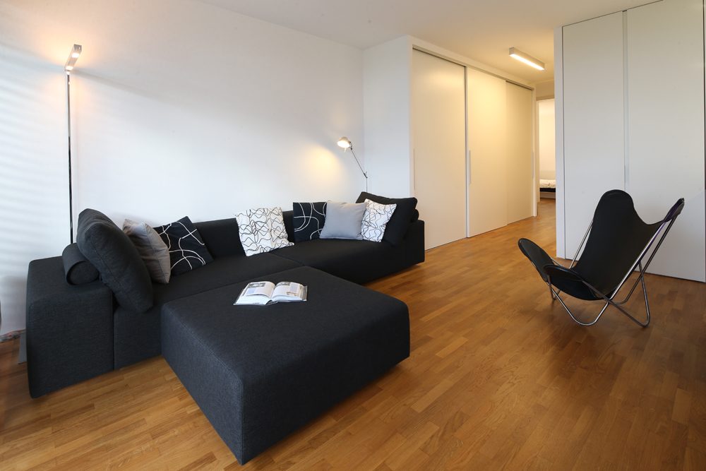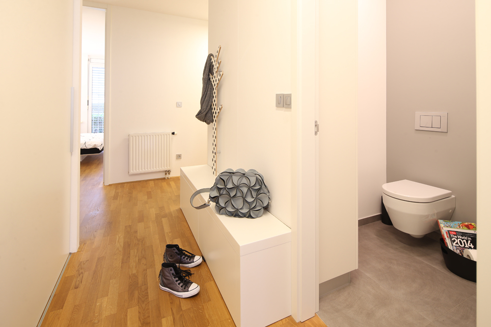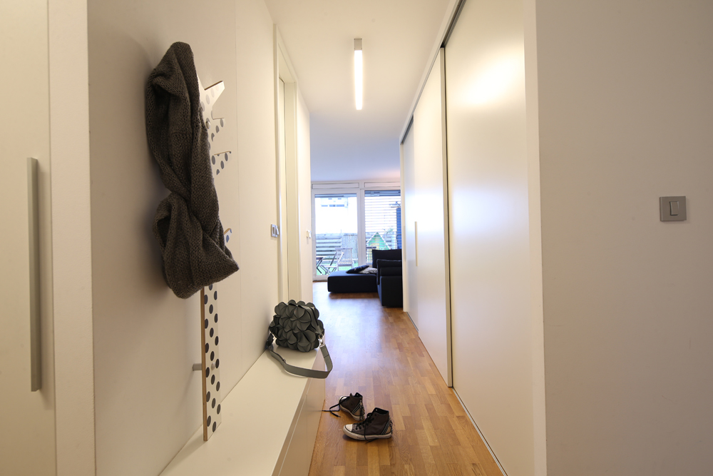 V mirni ljubljanski soseski blizu narave smo pomagali opremiti stanovanje mlade družine. V 10 let starem stanovanju je bil obstoječ masiven hrastov parket kakovosten, zato smo se ga odločili obdržati in obnoviti.
