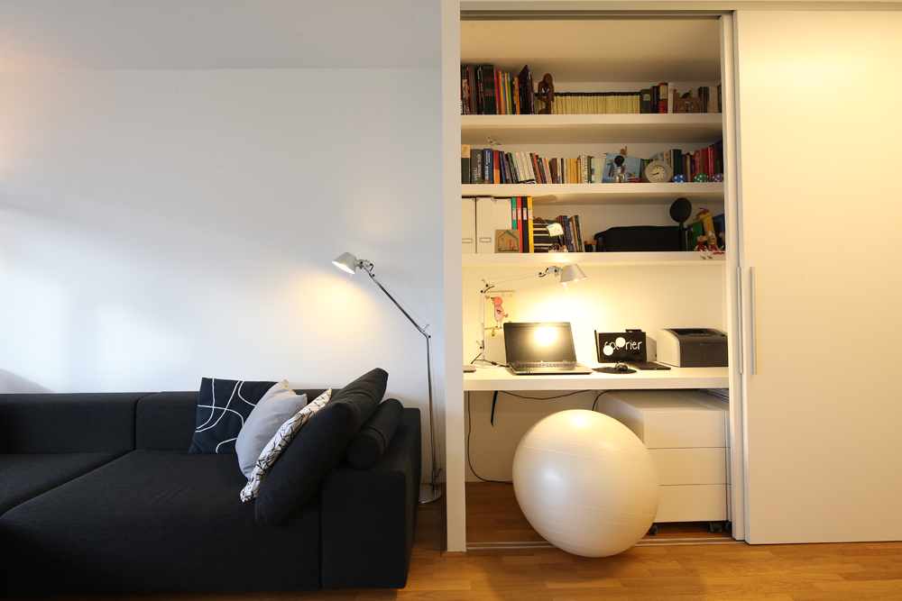 Prehodni postori so maksimalno izkoriščeni z vgradnimi omarami, kamor petčlanska družina pospravi kopico stvari. Ustvarjalni nered delovnega kotička z računalnikom se elegantno zakrije z drsnimi vrati vgradne omare.