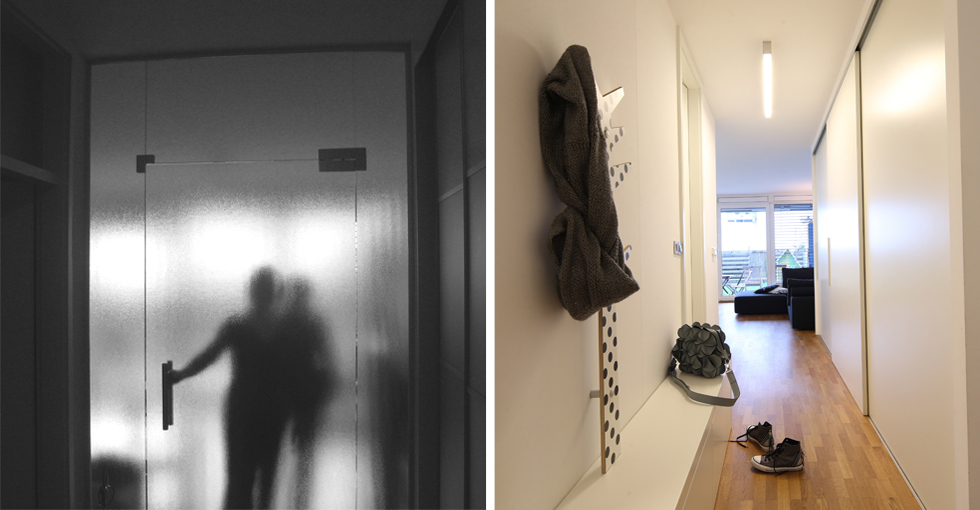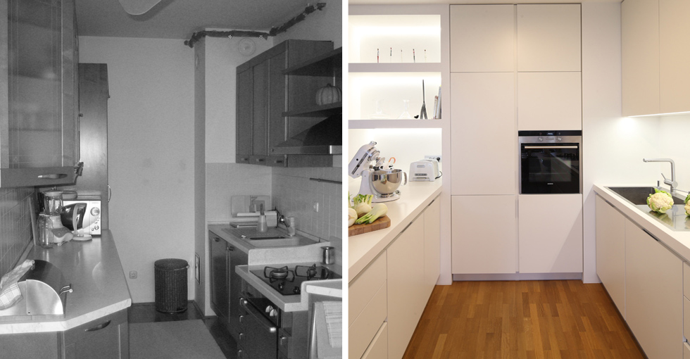 Po prvotnem načrtu je ozko kuhinjo in dnevno sobo delila predelna stena, hodnik pa je bil ločen z več vrati. V želji po bolj odprtem in pretočnem prostoru smo se znebili vseh nepotrebnih preprek.
